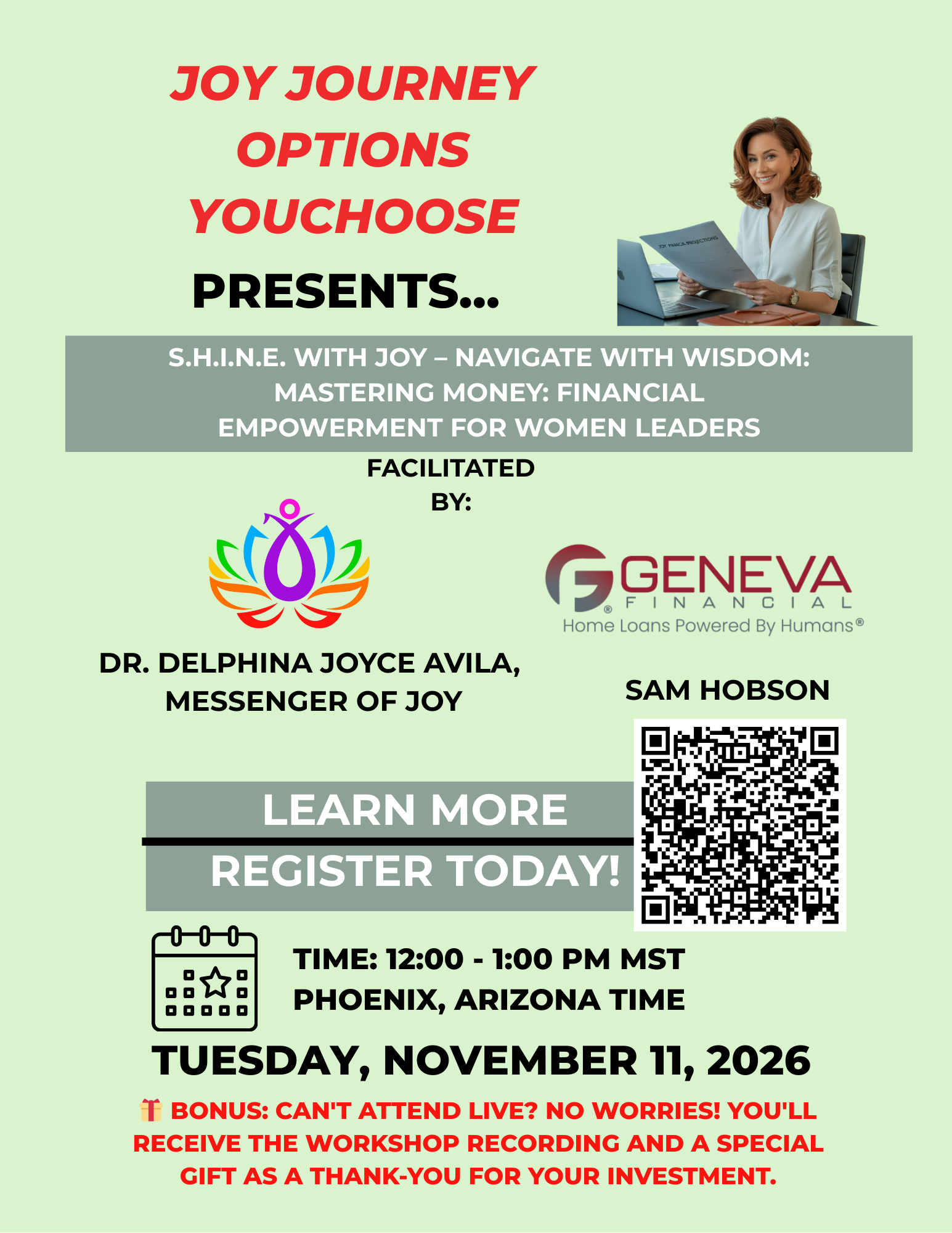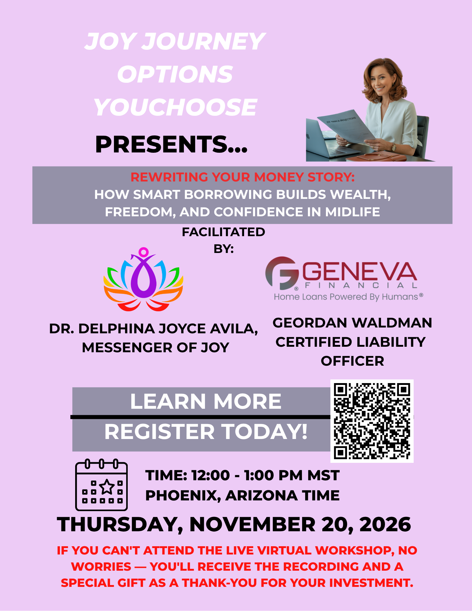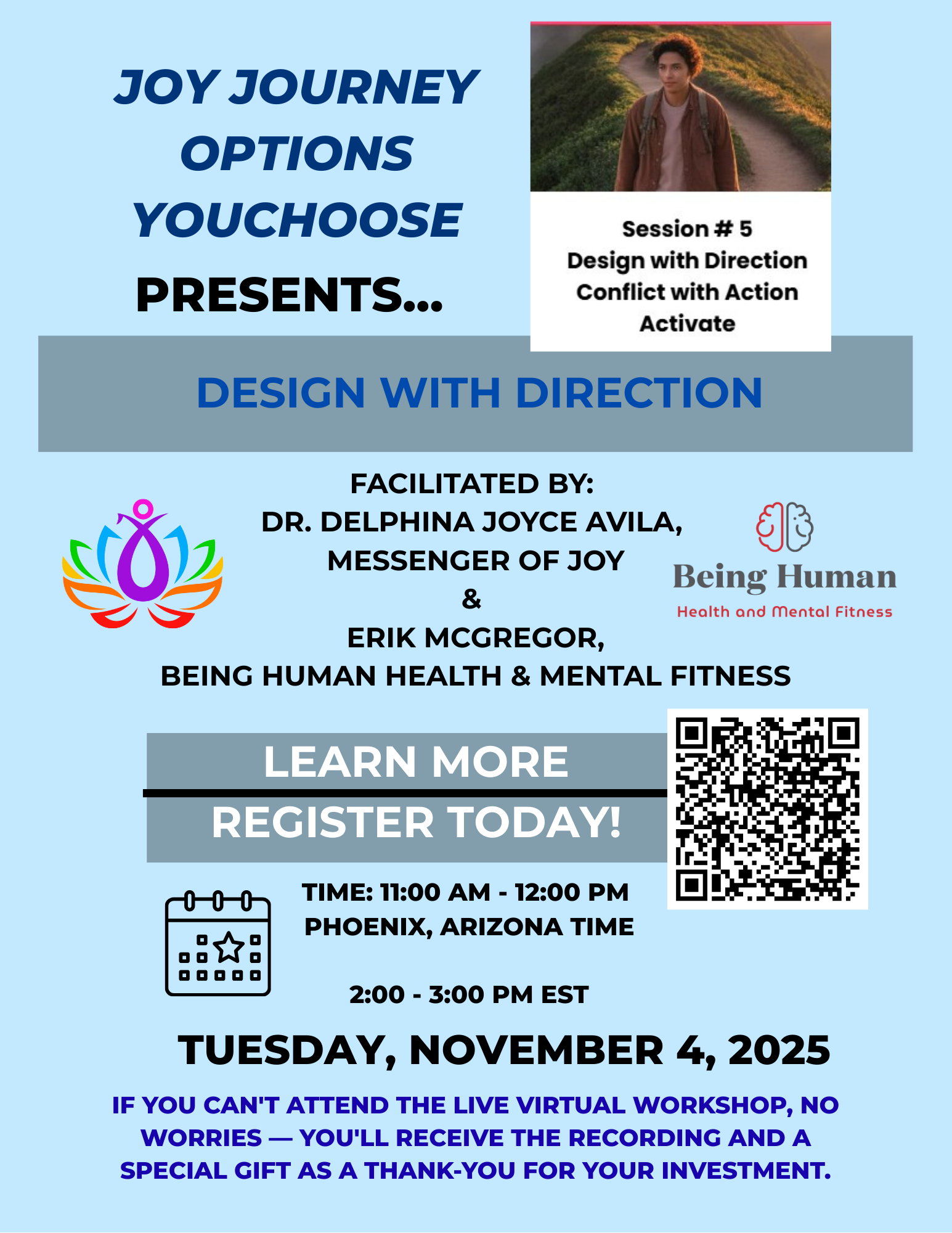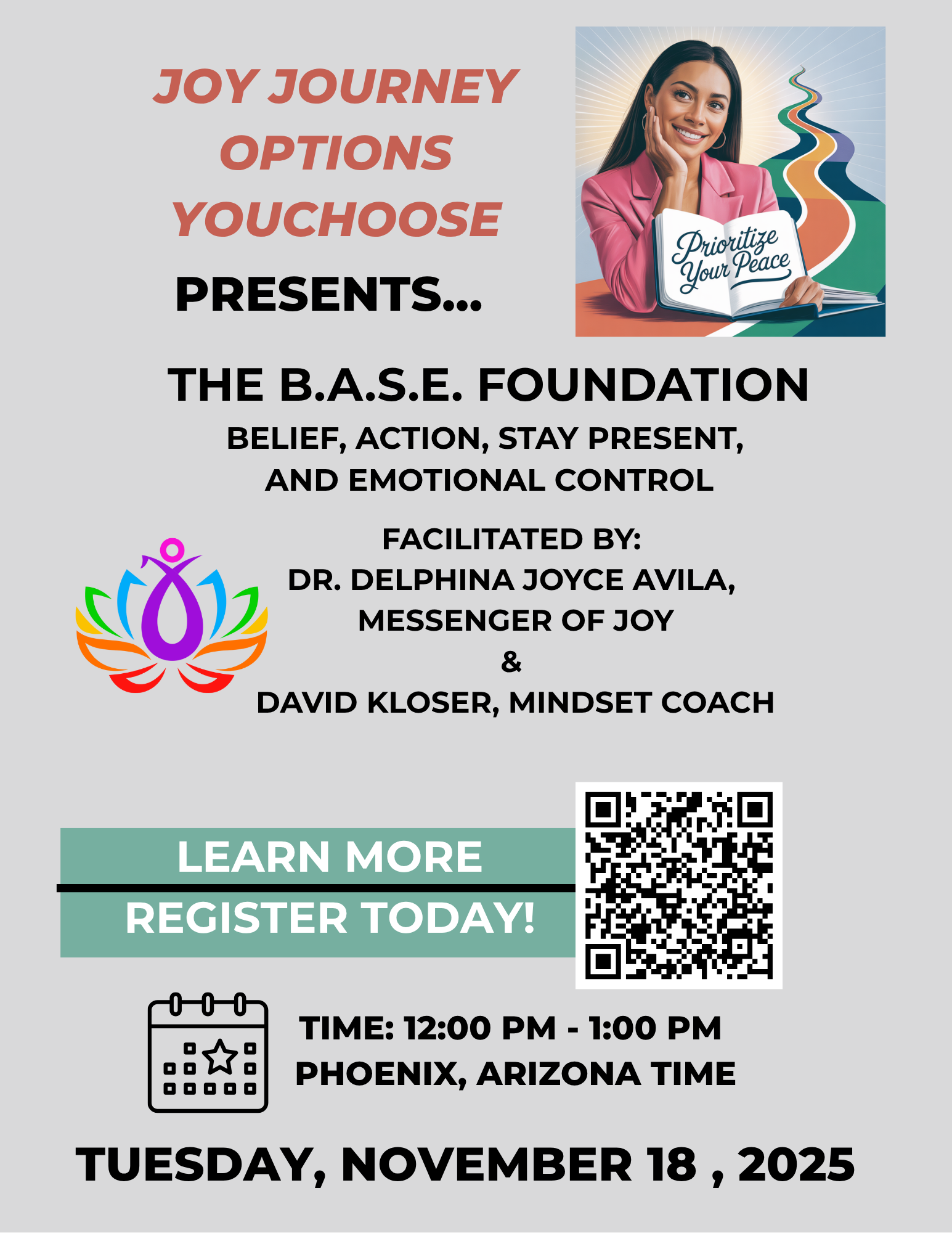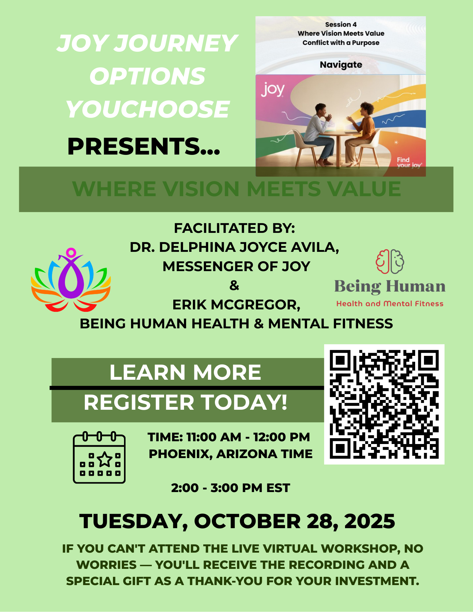 🌟 Where Vision Meets Value-Conflict with Purpose: Navigate Step into a sacred space where you’ll master strategies to guide difficult conversations toward clarity and resolution. This session helps you focus on what truly matters—trust, understanding, and growth—over being “right.” 🧭 You’ll Walk Away With: Tools to stay grounded in tough conversations Practices to focus on solutions, not positions Techniques to guide conflict toward growth and trust 🎟 General Admission: $27 🚀 Call to Action:It’s time to navigate conflict with courage and compassion. Join us and embrace your Mindset Reset through Conflict with JOY. 👑 Space is limited—reserve your spot now to reclaim your wellness, power, and purpose. If you can’t attend live, no worries—you’ll receive the recording and a special gift as a thank-you for your investment. ✨ Take the JOY Mindset Assessment to discover where you are in your self-leadership journey:👉 https://joyoptions.org/joy-mindset-assessment/