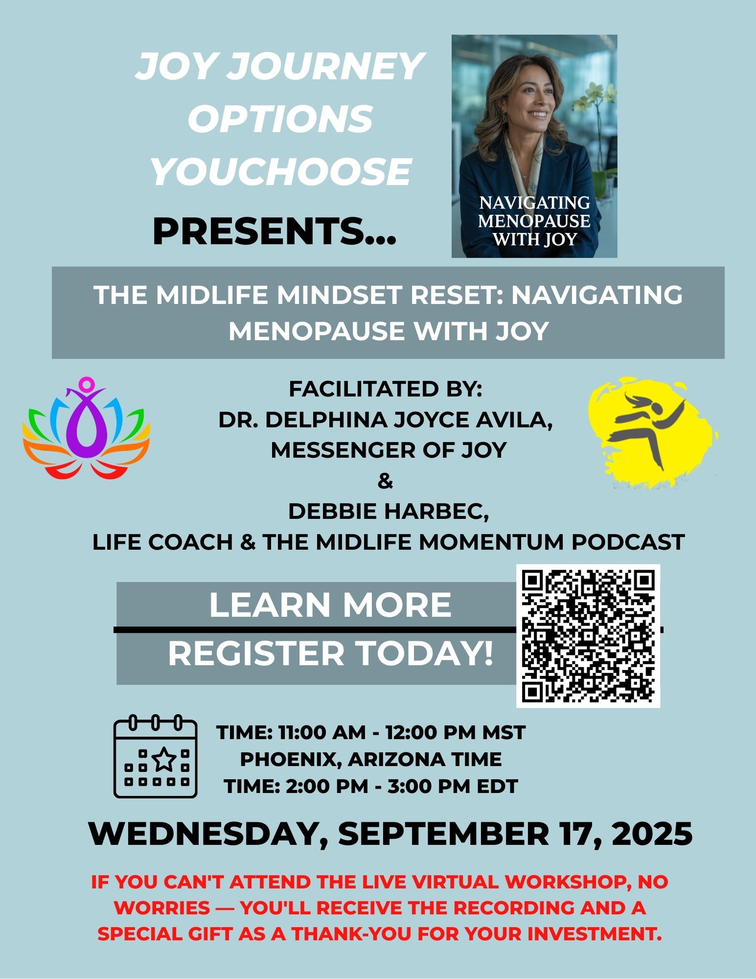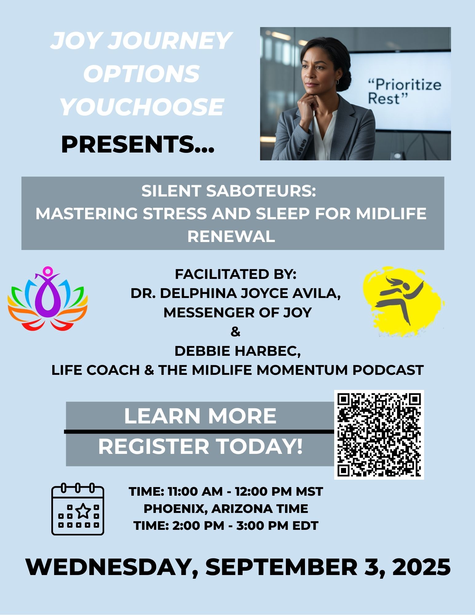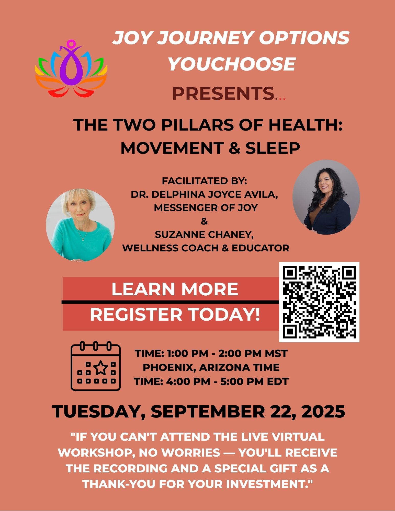 🧘 The Two Pillars of Health: Movement and Sleep Unlock the foundations of sustainable health through Exercise, and Sleep. 📅 Date: Tuesday, September 2, 2025⏰ Time: 4:00 – 5:00 PM EDT and 1:00 - 2:00 PM(Phoenix, Arizona Time)💻 Location: Virtual via Zoom📩 A calendar invite and Zoom link will be sent after registration.🤝 Hosted by: JOY Journey Options YouChoose (JOYOptions.org) and Suzanne Chaney. 🌿 Dear Beautiful Soul, You already know—true wellness doesn’t come from extremes or quick fixes. It comes from honoring your body’s wisdom, nurturing your energy, and creating habits that align with the life you want to live. The Two Pillars of Health: Movement and Sleep is your invitation to slow down, tune in, and realign with what your body and mind truly need. 🧘♀️ This isn’t just another wellness workshop. It’s a gentle, yet powerful space to explore how intentional movement and restorative sleep can help you feel more grounded, energized, and whole. ✨ Here’s what to expect: 📅 When: Tuesday, September 2, 2025⏰ Time: 4:00 – 5:00 PM EDT / 1:00 – 2:00 PM (Phoenix Time)💻 Where: Virtual via Zoom (link sent after registration)🎟 Investment: $27 During our time together, you’ll:🌸 Learn how to bring ease and consistency to your movement practices🌙 Create rituals for deep, nourishing sleep💛 Reconnect with what helps you feel balanced, focused, and alive Whether you’re just starting or realigning, this workshop meets you exactly where you are. Because your wellness isn’t a to-do list—it’s a way of living. 👣 Ready to begin?Reserve your spot today and take one small, powerful step toward lasting vitality: 🔎 Take the JOY Mindset Assessment to discover where you are in your wellness journey and how to rise stronger:👉 https://joyoptions.org/joy-mindset-assessment/ 💬 Contact: info@joyoptions.org Join us for an impactful session that empowers you to take charge of your health through a balanced and informed approach. With love and intention,The JOYOptions Teaminfo@joyoptions.org 🌺 Honor your body. Calm your mind. Live in your JOY.
