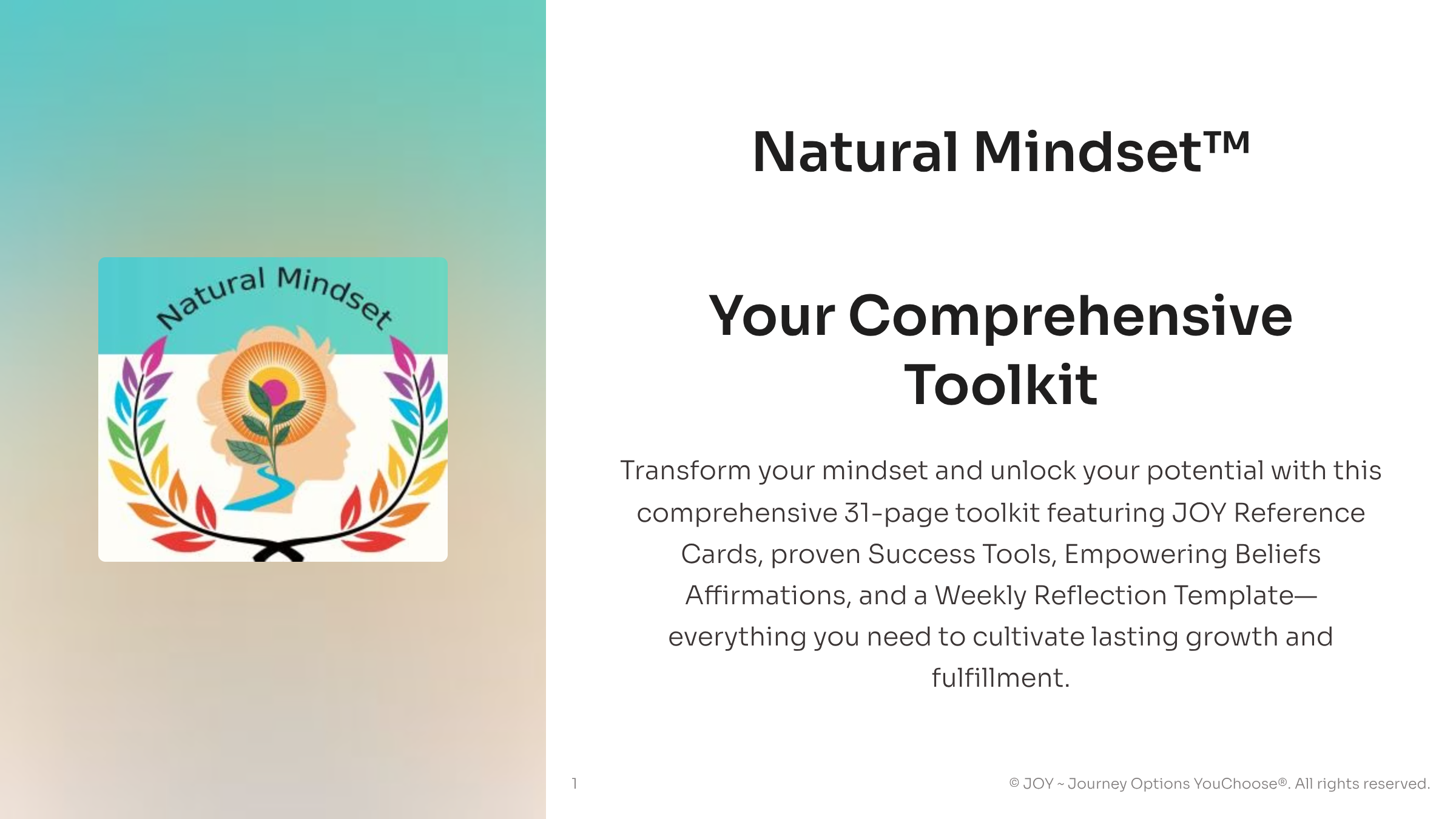 Designed as a 31-page guided toolkit, Natural Mindset™ supports you in moving beyond reactive thinking and into a state of intentional, self-led decision-making—where your values, beliefs, and actions finally work together.